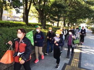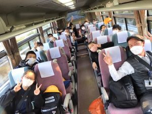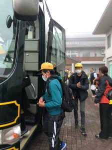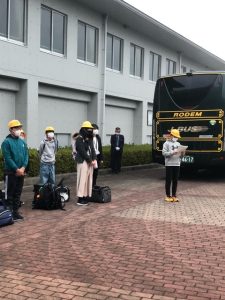 おうちの方、先生たちに「いってきます!」と元気な声で言ってバスに乗りました。さあ、広島に向けて出発です。