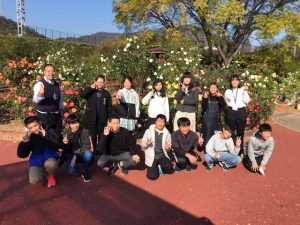 途中、福山サービスエリアで休憩をとりました。福山はバラの町。美しいバラの前でパチリ☆広島市内まであと少しです。