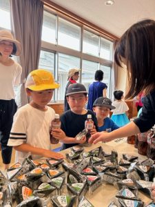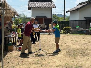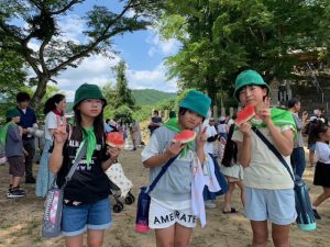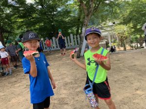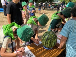 7月29日(土)「大山ふれあいすいか祭り」が開催されました。本年度も子どもたちは大山緑の少年団として参加しました。例年、大山緑の少年団では、地域の方々のご指導いただきながら、すいかを栽培しています。それらのすいかを品評会に出品し、その他、販売もしました。今年はなかなか出来がよかったようです。