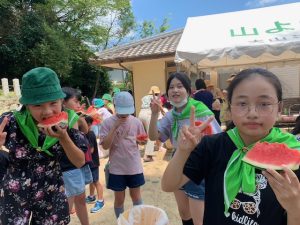 子どもたちが楽しみにしていた試食では、しゃりしゃり感と甘みがしっかりとあり、さすが大山すいか。とてもおいしかったです。