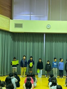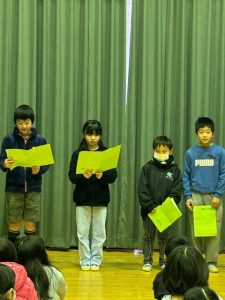 2/1(木)3年生によるスピーチタイムがありました。全校生にお気に入りの本を紹介しました。紹介の内容は、「本の題名・あらすじ・お勧めする理由」の3点です。大きな声でゆっくりと話す等、聞いてもらう人によく伝わるように工夫することができました。このスピーチタイムをきっかけに、図書室に足を運ぶ子がさらに増えるといいですね♪
