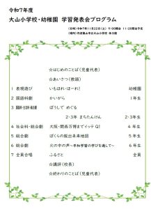 R7年度学習発表会プログラム 投稿日時: 2025年11月19日 投稿者: ooyamahp 令和7年11月22日(土)に予定しています大山幼小「学習発表会」のプログラムです。多くの皆様のご来校をお待ちしています。 R7学習発表会プログラム(PDF)