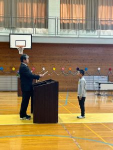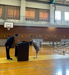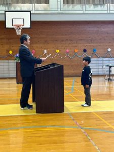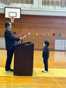 本日(3/22)で令和5年度のすべての教育課程が修了となります。体力館で修了式を行いました。学年で代表児童1名に修了証を渡しました。通知表の最後のページが修了証になっています。どの代表の子も名前を呼ばれたら大きな声で返事をして、堂々と受け取ることが出来ました。