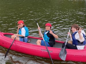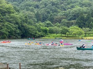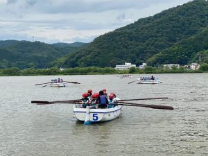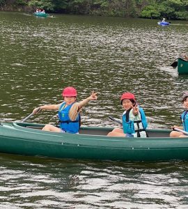 自然学校5日目最終日は、円山川でカヌー・カヤック・カッター体験をしました。カヌー(3人乗り)・カヤック(1人乗り)では、初めのうちはバランスをとるのが難しそうでしたが、コツをすぐに覚え、スムーズに漕ぐことができました。また、カッターでは、艇長の指示のもと、力を合わせて漕ぎ進めていきました。みんな一緒に漕ぐ楽しさを存分に味わうことができました。