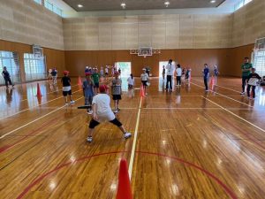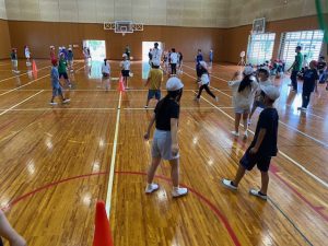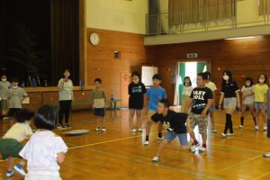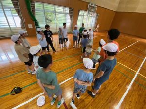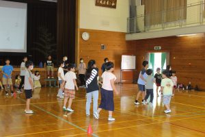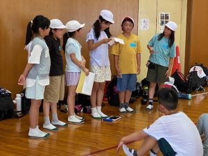 自然学校4日目は、活動班遊びをしました。進行は、大山小学校が担当です。自然学校ばくだんゲームとフリスビードッジを楽しみました♪一緒に遊ぶ中で、さらに他校の子たちと仲良くなることができました。
