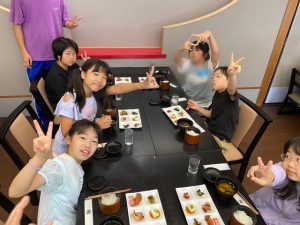 1日目の夕食はごちそうで、みんな大喜びでした。おなかいっぱい食べて2日目の活動に備えます。みんな元気です。天気に恵まれますように・・・。