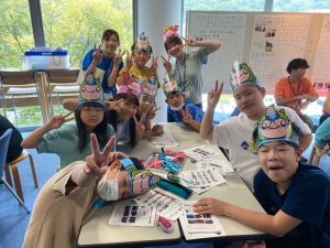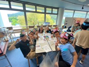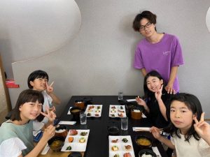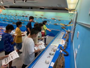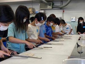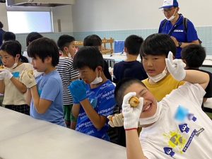 早いもので自然学校は、もう4日目を迎えました。今日も16人元気に過ごしています。朝食をしっかり食べて、いざ、香住へ!!海の景色を眺めながら、バスで香住へ向かいました。海の文化館では、ちくわ作り体験、館内見学、ワークショップ等の活動をしました。