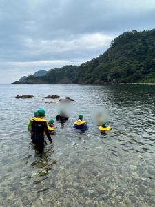 自然学校3日目は、海でのスノーケル体験をしました。竹野の海を見た瞬間、「わ~!!海だ!!」と目を輝かせながら笑顔がこぼれました。さあ!早速、ウェットスーツを着て海へ~♪
